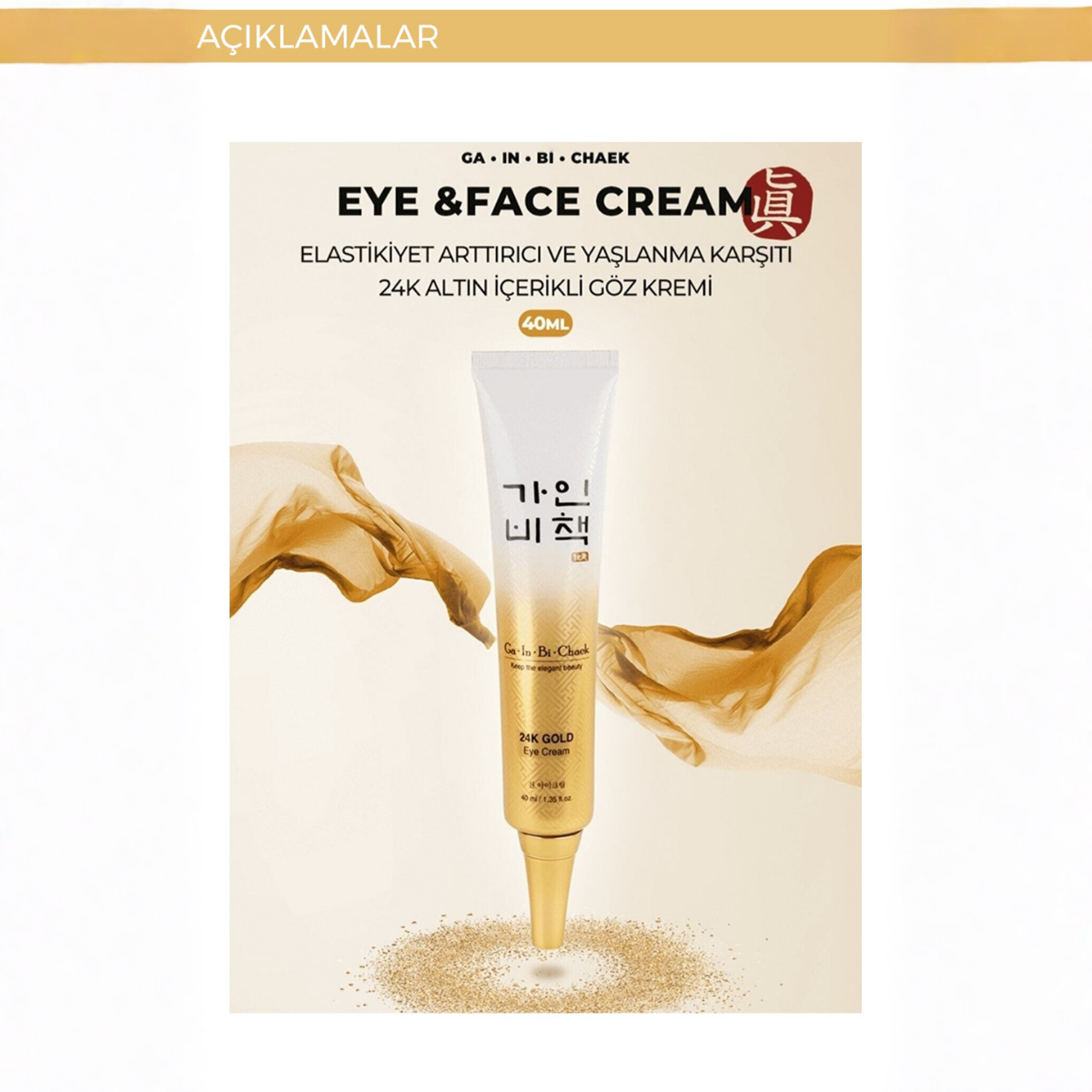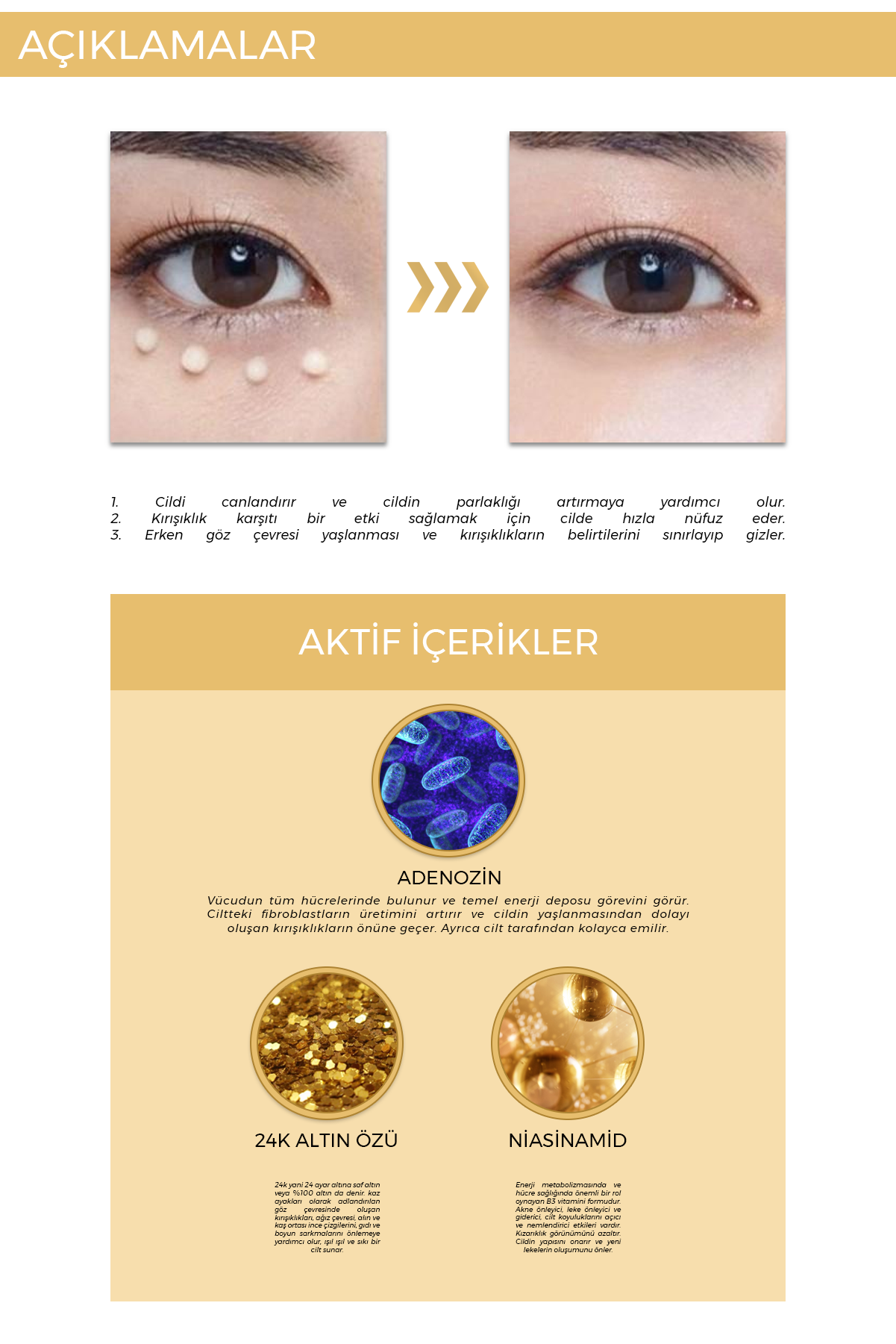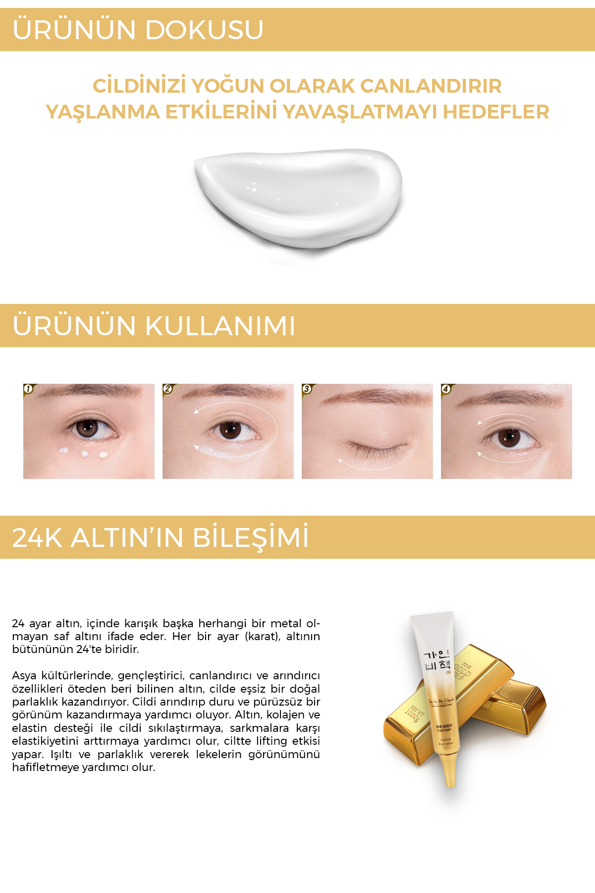 24K Altın: Antioksidan etki sunarak göz çevresine parlak ve canlı bir görünüm kazandırmaya yardımcı olur.