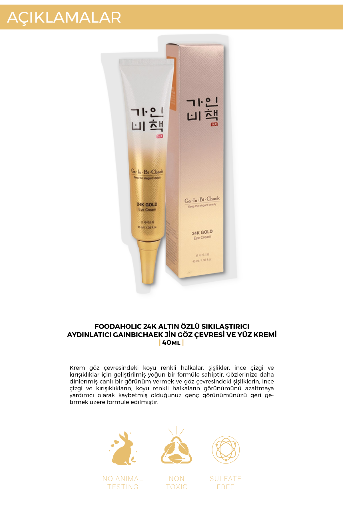 FOODAHOLIC Ga In Bi Chaek 24K Gold Eye Cream, göz çevresine aydınlık, canlılık ve yoğun nem kazandırmaya yardımcı olur. 24K altın parçacıkları ve niasinamid içeren formülü, göz altı koyu halka ve yorgun görünümün azalmasını desteklerken daha pürüzsüz bir göz çevresi görünümüne katkı sağlar.