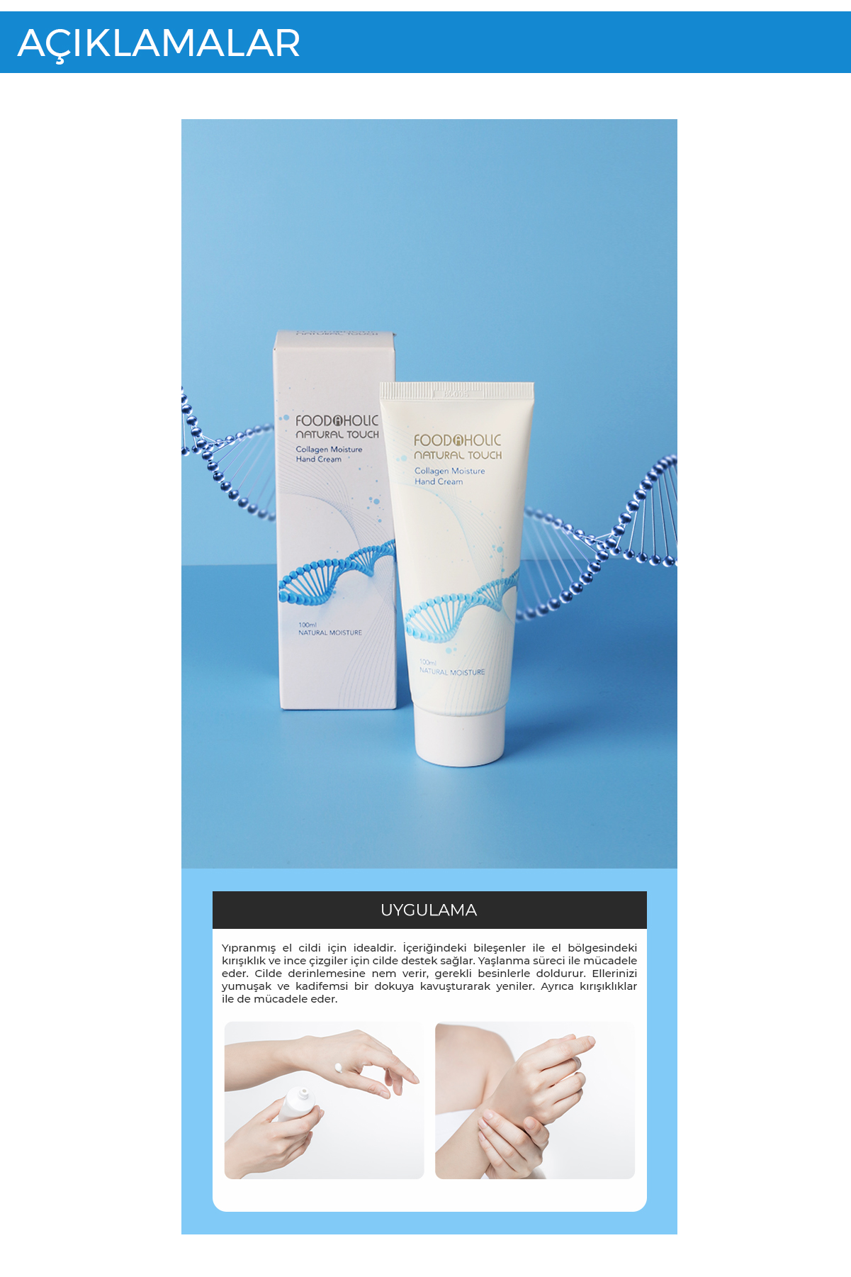 FOODAHOLIC Collagen Hand Cream, hidrolize deniz kolajeni ile formüle edilmiş, elleri ve tırnak etlerini derinlemesine nemlendiren, besleyen ve yaşlanma belirtilerine karşı bakım sağlayan yoğun etkili bir el kremidir.