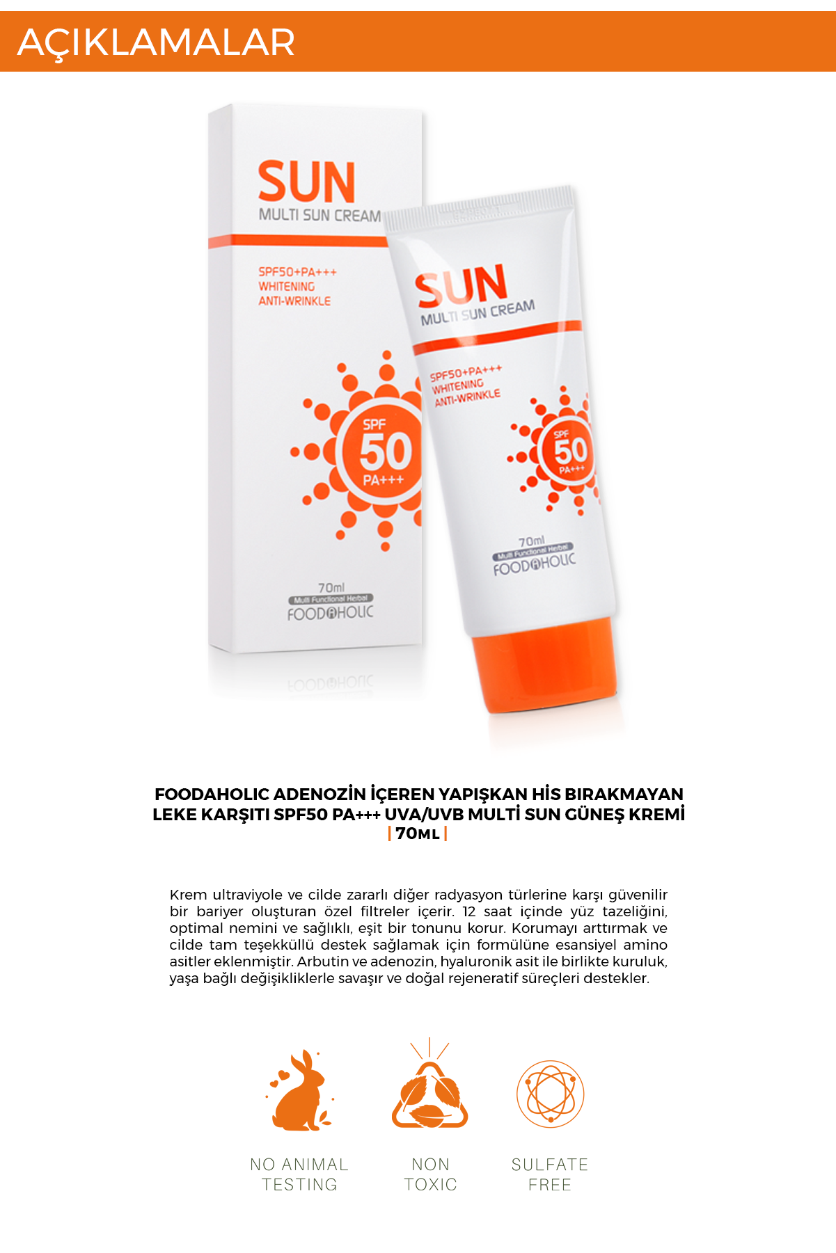 FOODAHOLIC Adenozin İçeren Yapışkan His Bırakmayan Leke Karşıtı SPF50+ PA+++ UVA/UVB Güneş Kremi 70 ml