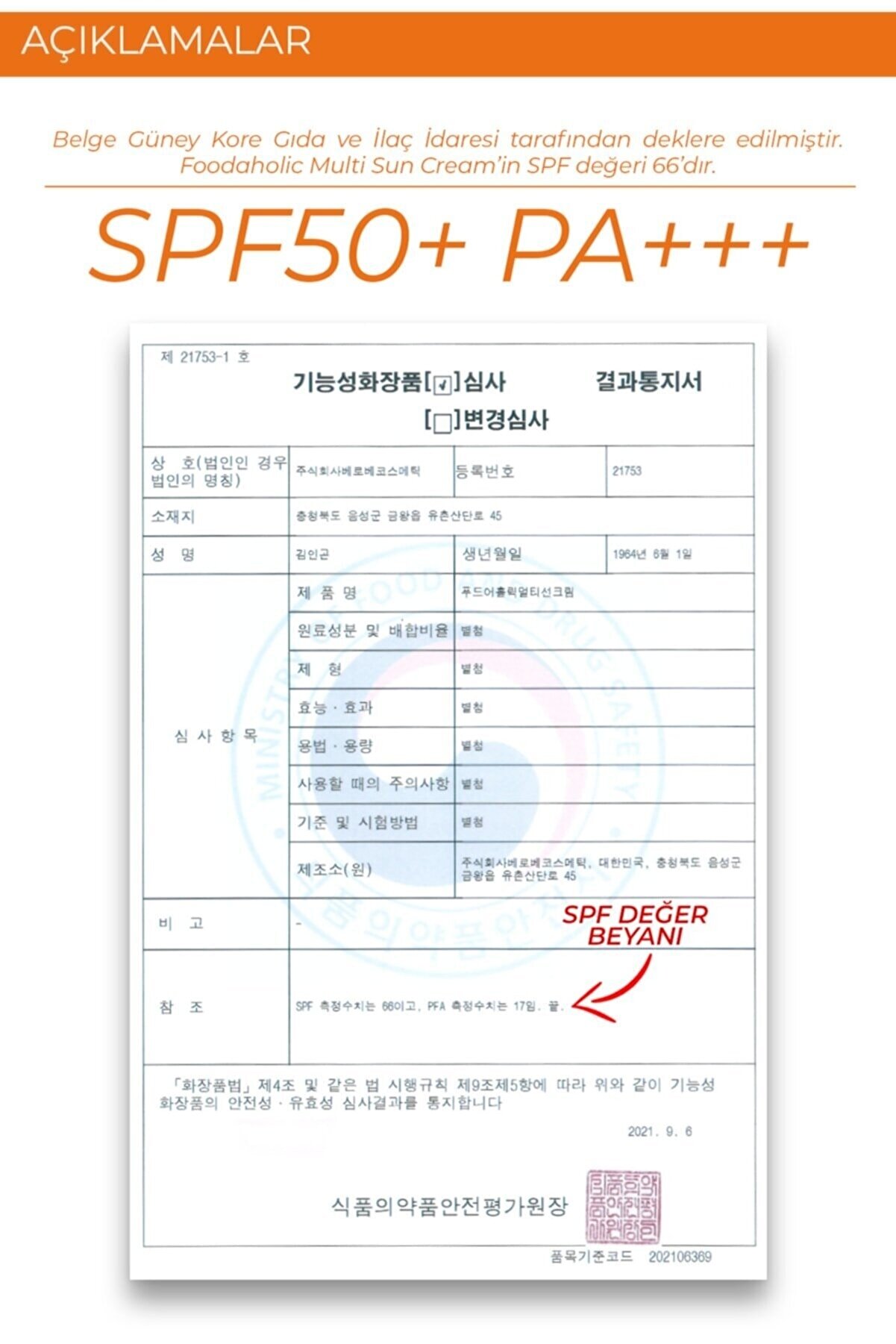 FOODAHOLIC Multi Sun Cream SPF50+ PA+++, cildi UVA & UVB ışınlarına karşı yüksek düzeyde koruyan, leke karşıtı ve yaşlanma karşıtı destek sunan hafif dokulu bir güneş kremidir. Özel filtreleri sayesinde güneşin ve çevresel radyasyonun zararlı etkilerine karşı ciltte güvenilir bir bariyer oluşturur.