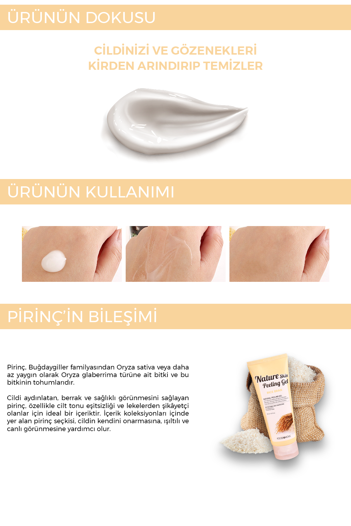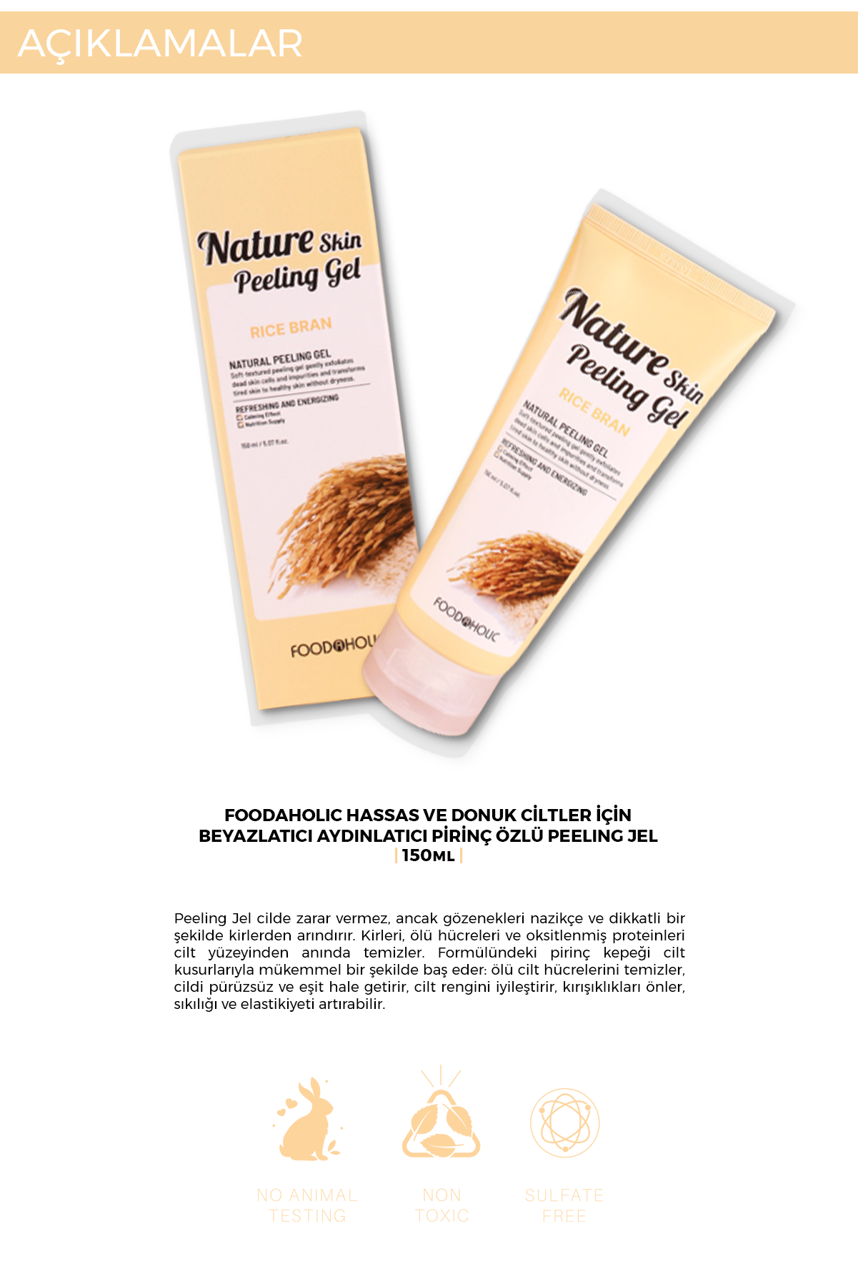 FOODAHOLIC Nature Skin Rice Bran Peeling Gel, pirinç kepeği özü ile zenginleştirilmiş, hassas ciltlere uygun nazik bir peeling jelidir. Cilt yüzeyinde biriken ölü hücreleri tahrişe neden olmadan arındırır; düzenli kullanımda cildin daha aydınlık, pürüzsüz ve canlı görünmesine yardımcı olur.