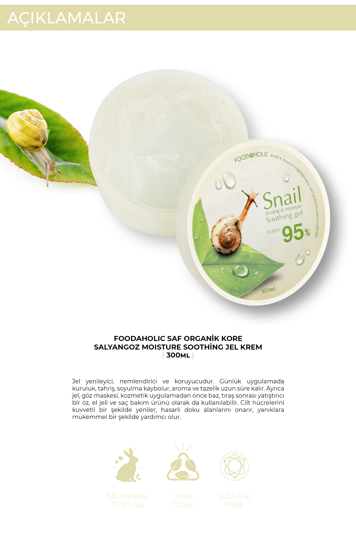 FOODAHOLIC Saf Organik Kore Salyangoz Özlü Nemlendirici & Yatıştırıcı Jel Krem 300 ml