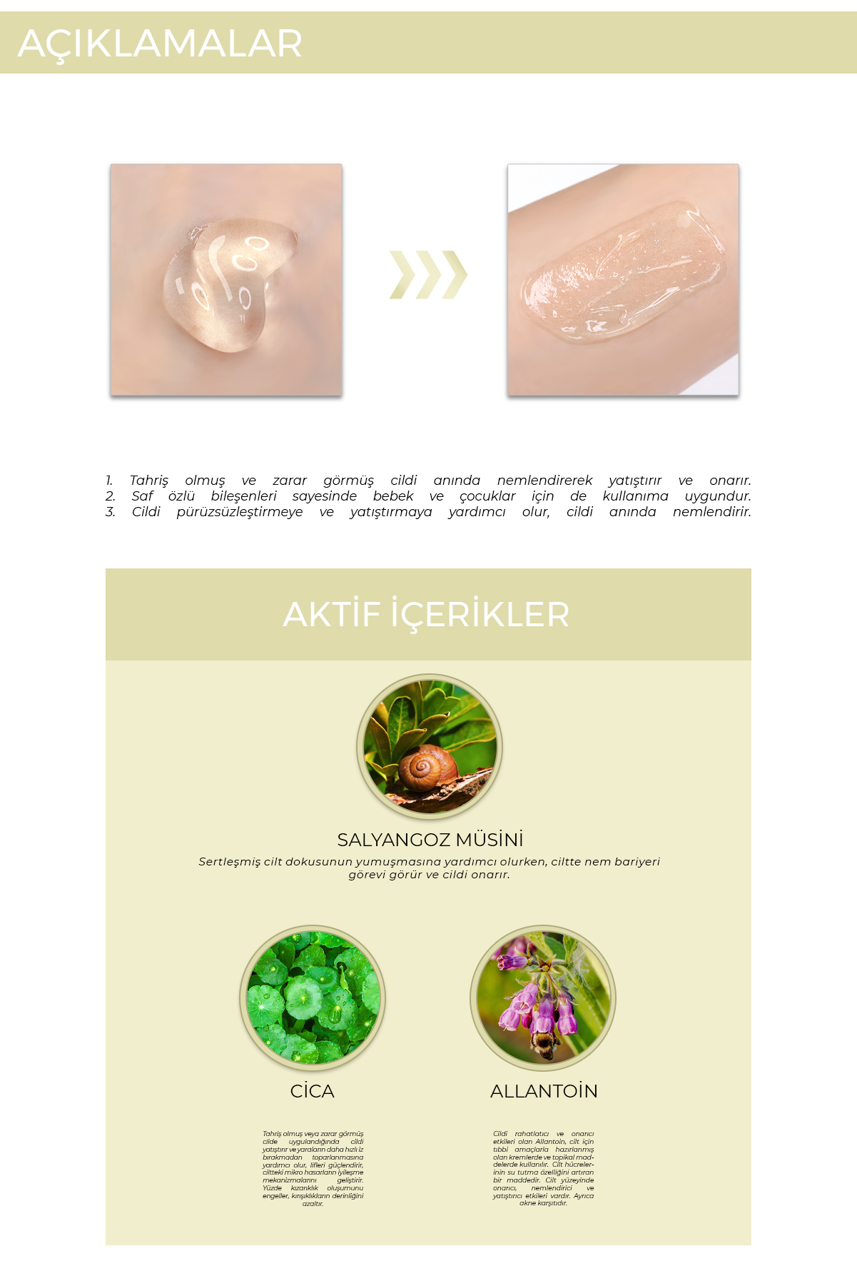 Cilt yenilenmesini destekler, onarıcı bakım sağlar ve cildin daha pürüzsüz görünmesine yardımcı olur.