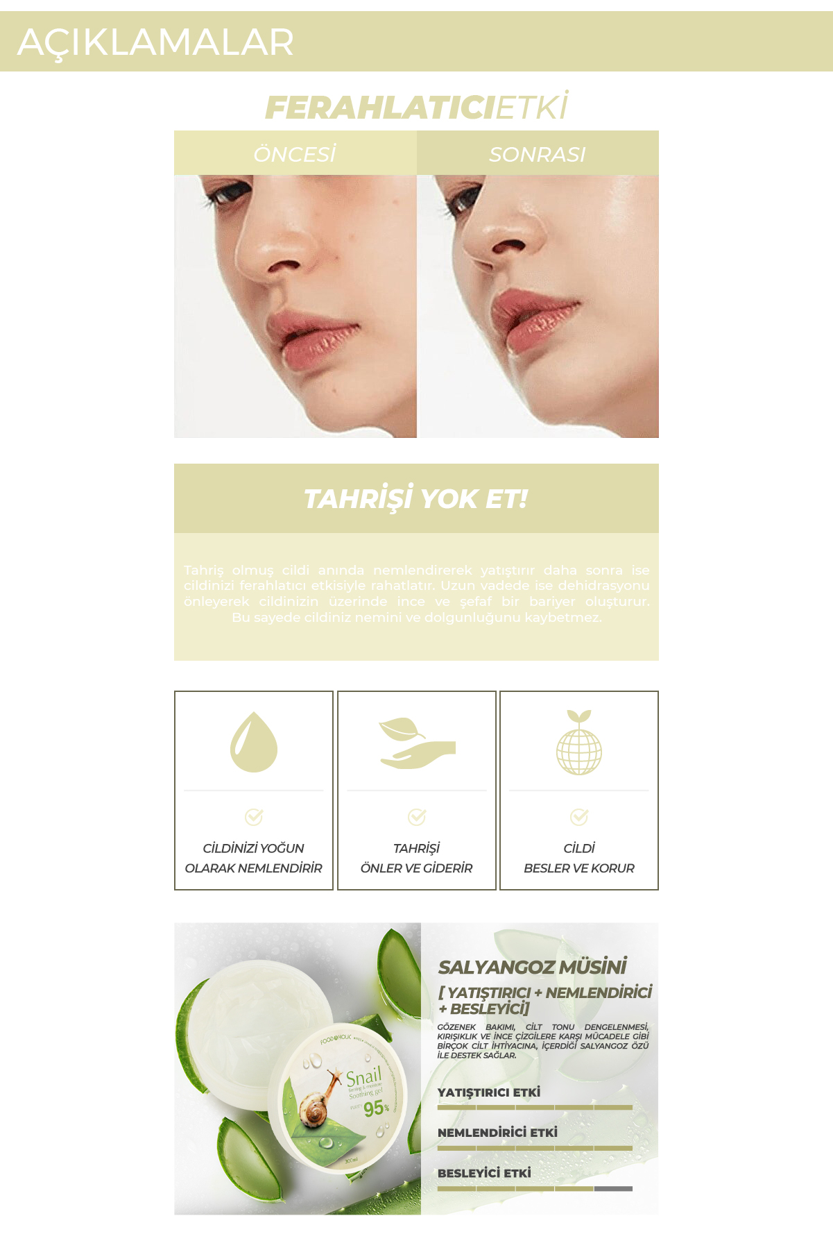 FOODAHOLIC Saf Organik Salyangoz Moisture Soothing Jel Krem, çok amaçlı kullanıma uygun, yenileyici ve yoğun nemlendirici bir jel kremdir. İçeriğindeki salyangoz mukus özü, centella asiatica, aloe benzeri bitkisel özler ve hyaluronik asit sayesinde cildi yatıştırmaya, onarmaya ve nemlendirmeye yardımcı olur.