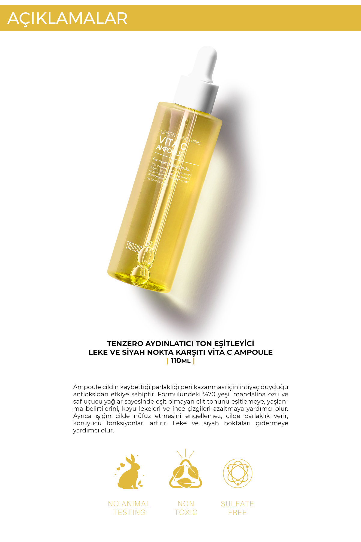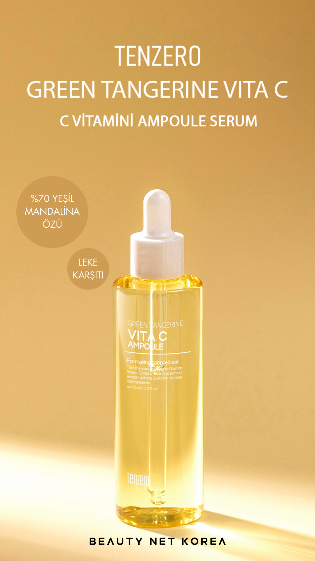 TENZERO Green Tangerine Vita C Ampoule Serum, cildin daha aydınlık, canlı ve eşit tonlu görünmesine yardımcı olur. Yüksek oranda yeşil mandalina özü ve C vitamini içeren formülü sayesinde cildin kaybettiği parlaklığı geri kazanmasını destekler.