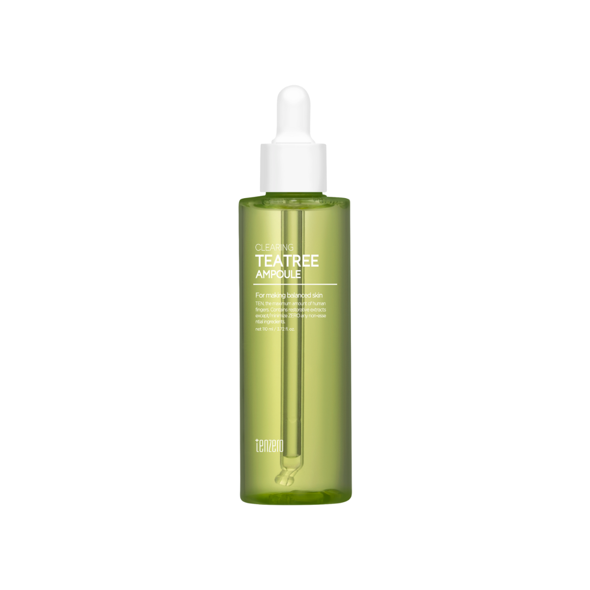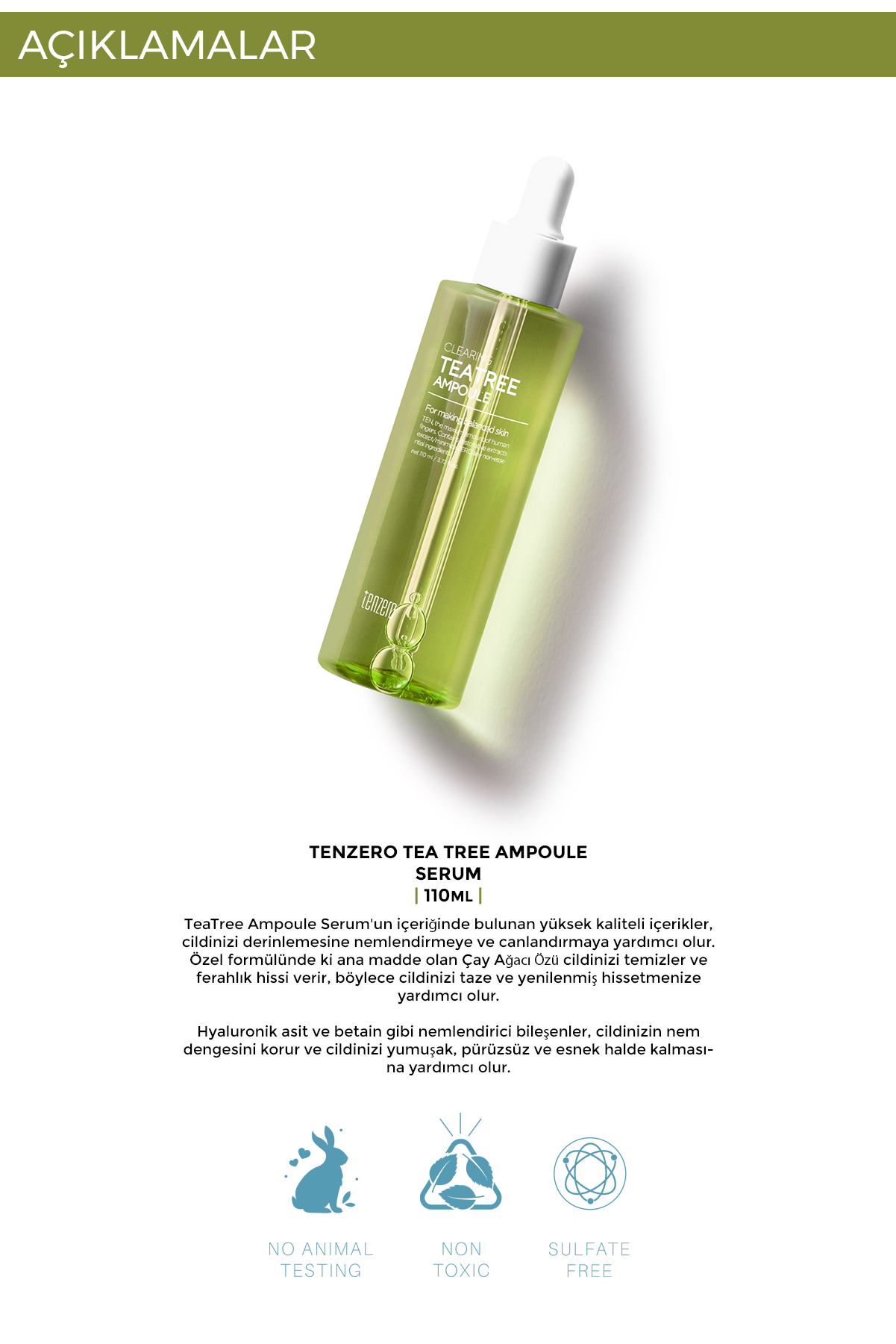 TENZERO Clearing Tea Tree Ampoule Serum, yağlı ve akneye eğilimli ciltler için özel olarak geliştirilmiş, dengeleyici ve yatıştırıcı bir bakım sunar. Çay ağacı özü içeren formülü sayesinde cildin arınmasına yardımcı olurken fazla sebumun dengelenmesini destekler.