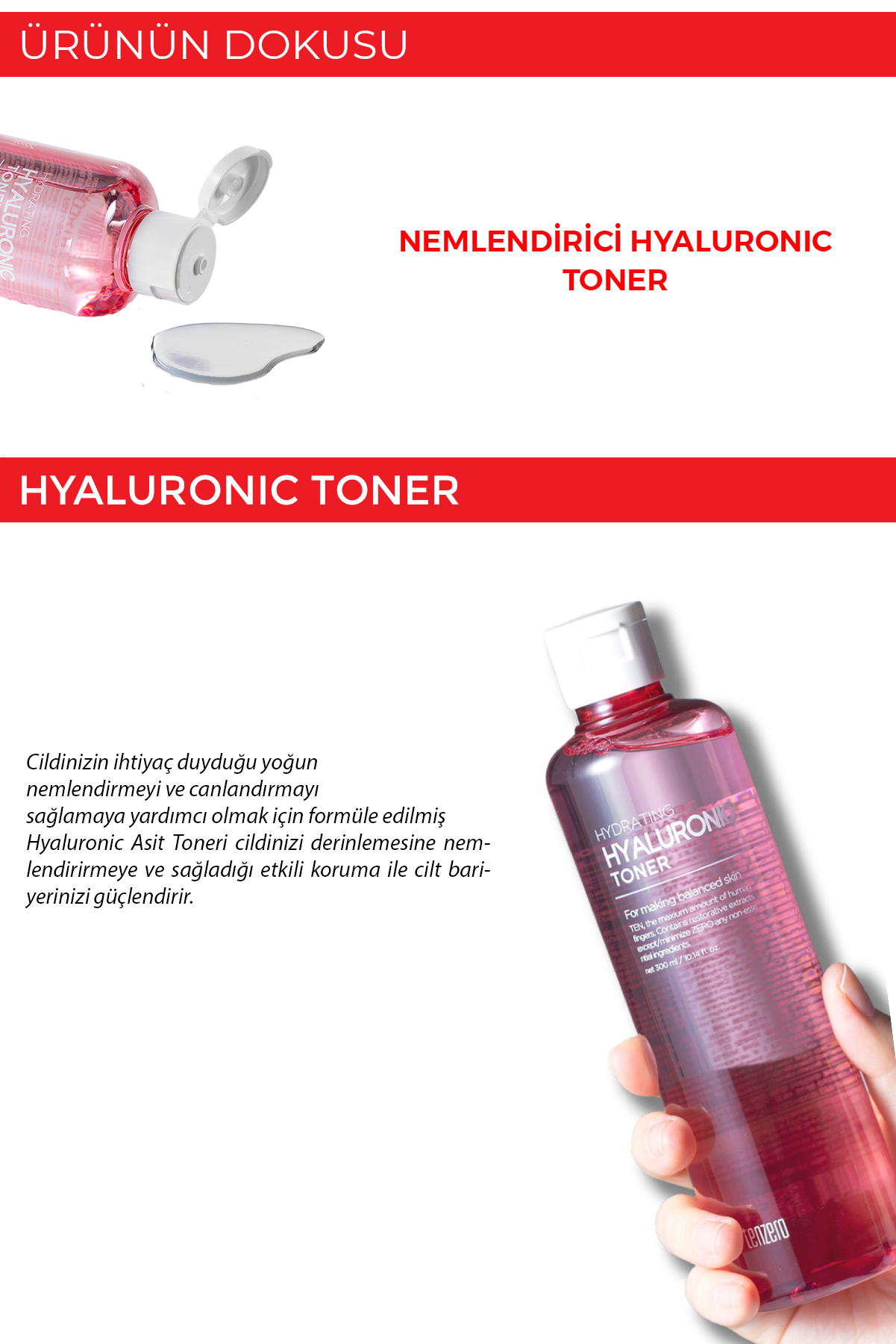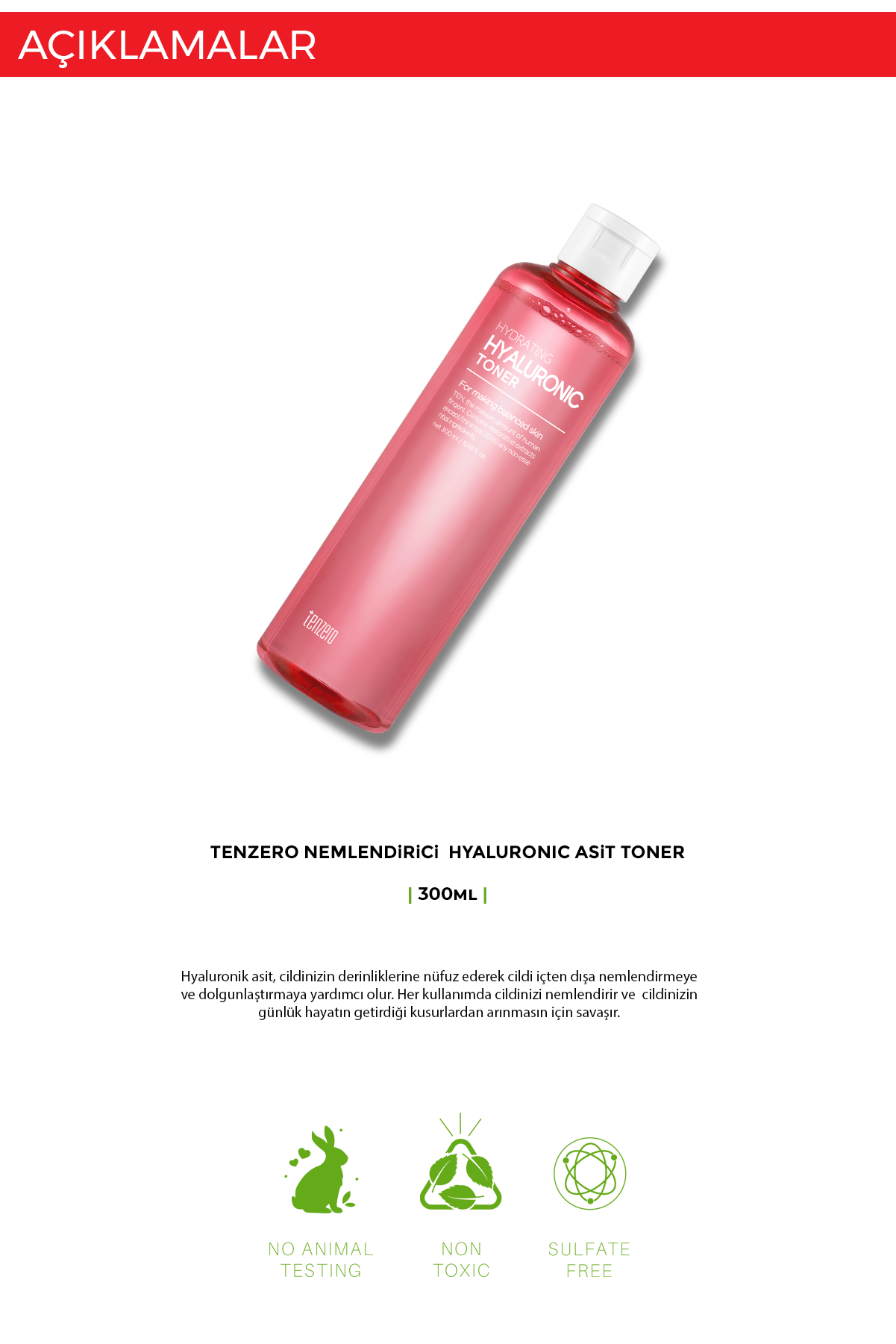 TENZERO Hyaluronic Acid Toner, cildi derinlemesine nemlendirmeye yardımcı olurken cildin daha dolgun, canlı ve elastik görünmesini destekler. Temizlik sonrası cildin kaybettiği nemi geri kazandırmaya yardımcı olur ve bakım ürünlerinin daha iyi emilmesini sağlar.