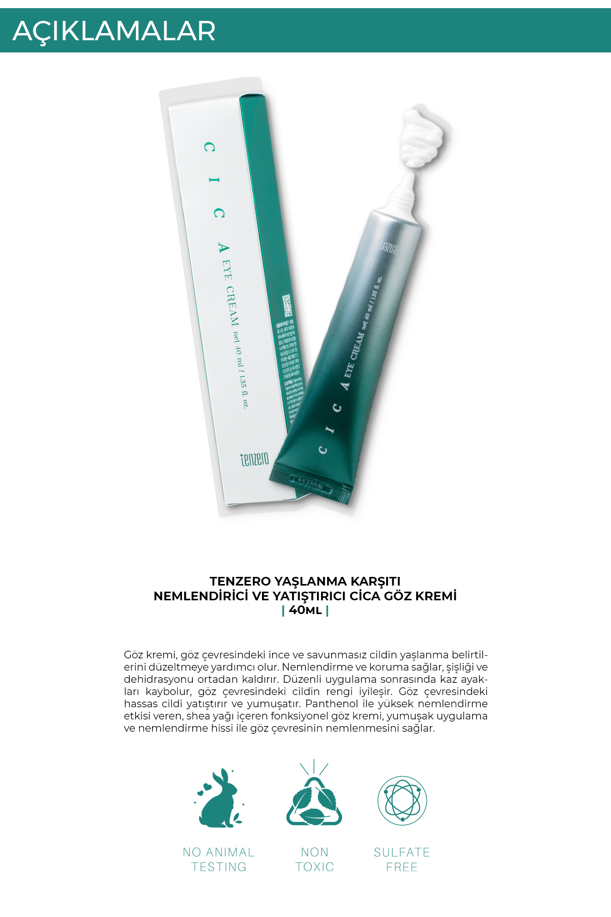 TENZERO Hyaluronik Asit ve Niasinamid içeren göz kremi, göz çevresinin yoğun şekilde nemlenmesine yardımcı olurken ince çizgi, morluk ve yorgun görünümün azalmasını destekler. Hassas göz çevresi için özel olarak formüle edilen yapısı, cildi yatıştırmaya ve daha pürüzsüz bir görünüm kazandırmaya yardımcı olur.