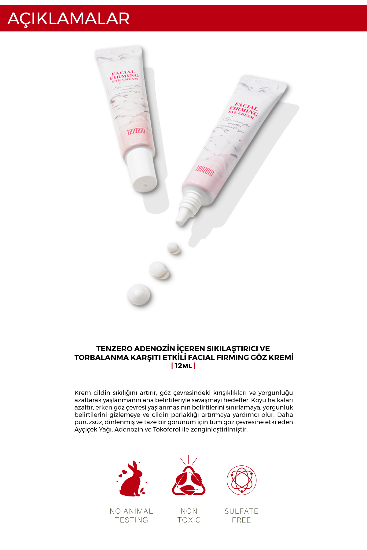 TENZERO Facial Firming Eye Cream, göz çevresinin kaybettiği elastikiyeti desteklemeye yardımcı olurken ince çizgi ve kırışıklık görünümünün azalmasına katkı sağlar. Adenozin ve E vitamini (tocopherol) içeren formülü sayesinde göz çevresini yoğun şekilde nemlendirir ve daha pürüzsüz bir görünüm kazanmasına yardımcı olur.