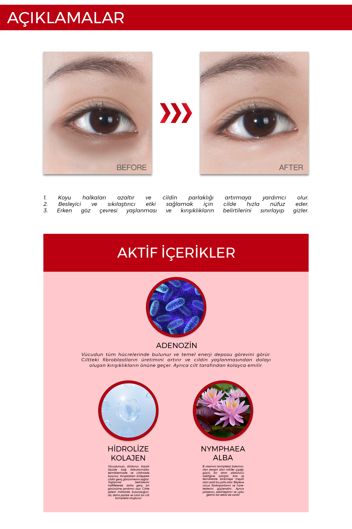 ✔ Göz çevresinin daha sıkı ve pürüzsüz görünmesine katkı sağlar