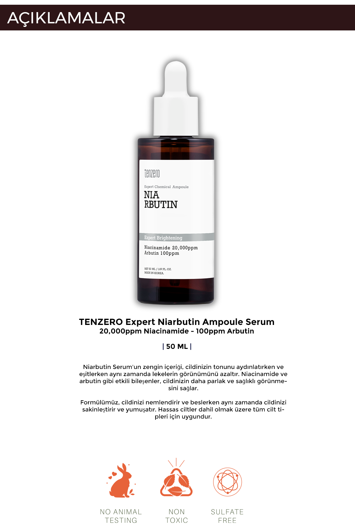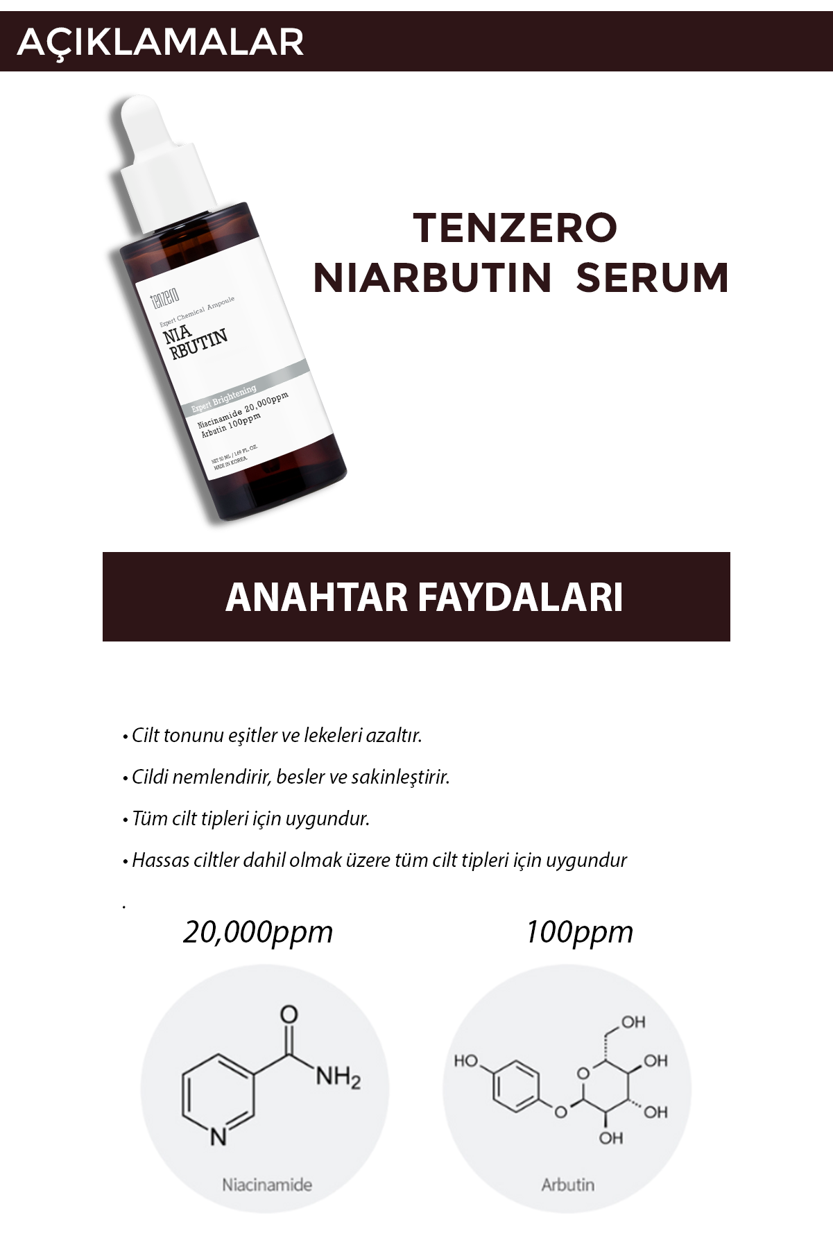 TENZERO Expert Chemical Niarbutin Ampul Serum, yüksek oranda niasinamid (20.000 ppm) ve arbutin (100 ppm) içeren formülüyle cilt tonu eşitsizliğinin azalmasına ve daha aydınlık bir cilt görünümüne yardımcı olur. Düzenli kullanımda leke ve pigmentasyon görünümünün azalmasını desteklerken cilt bariyerinin güçlenmesine katkı sağlar.