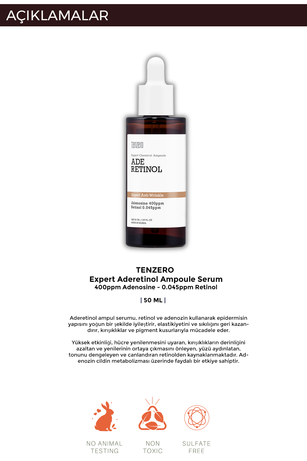 TENZERO Expert Chemical Ampoule ADE Retinol, düşük doz retinol (0.045 ppm) ve adenozin (400 ppm) içeren formülüyle cilt bariyerini destekleyerek yaşlanma belirtilerine karşı bakım sunar. Cildi hassaslaştırmadan ince çizgi ve doku düzensizliği görünümünün azalmasına yardımcı olur.