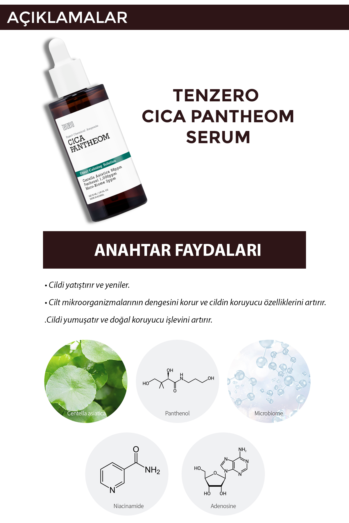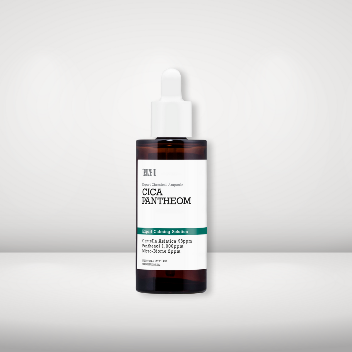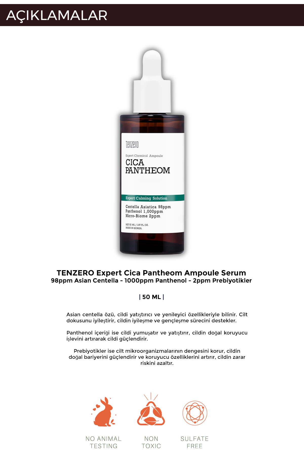 TENZERO Expert Chemical Ampoule Cicapanteome, hassas ve bariyeri zayıflamış ciltler için geliştirilmiş onarım ve yatıştırma odaklı bir ampul serudur. Centella Asiatica kompleksi, Panthenol (B5 Vitamini), Seramid NP ve mikrobiyom destekleri ile cilt bariyerinin güçlenmesine, nem dengesinin korunmasına ve hassasiyet görünümünün azalmasına yardımcı olur.