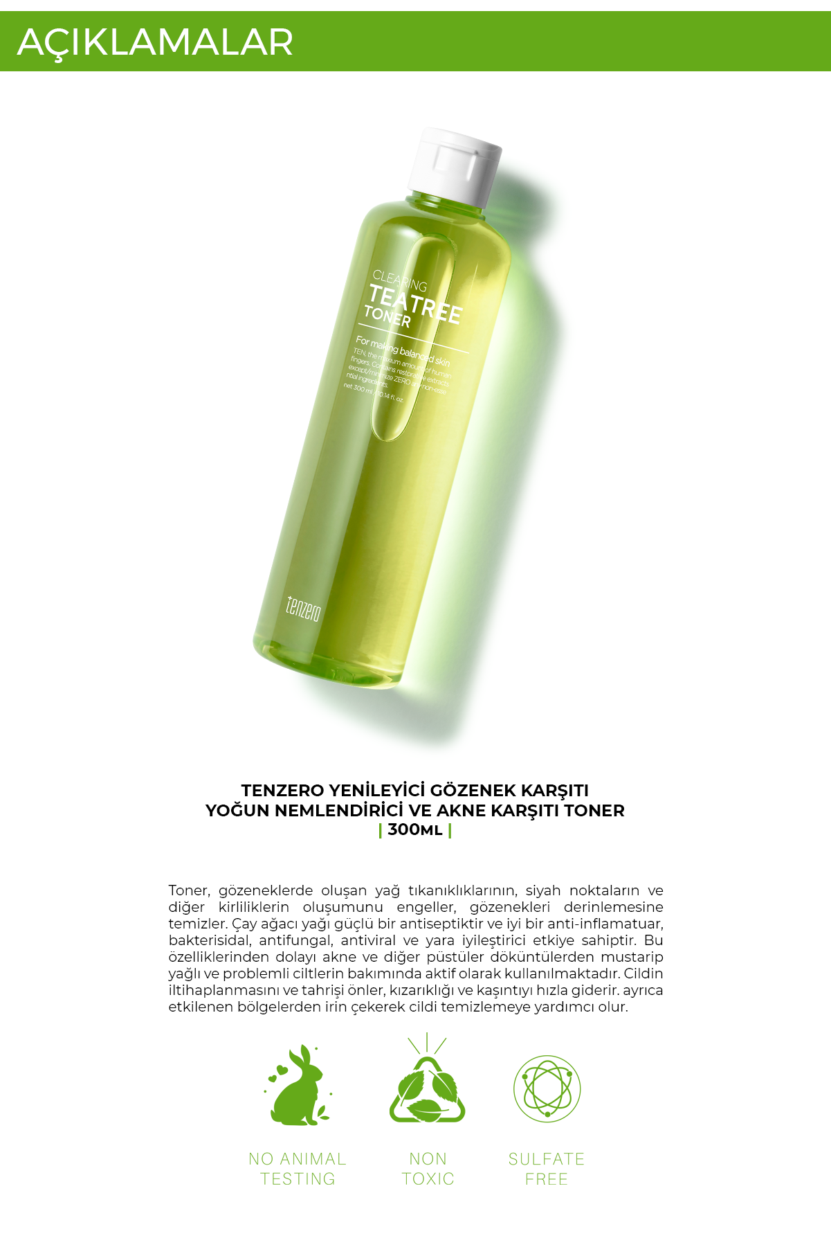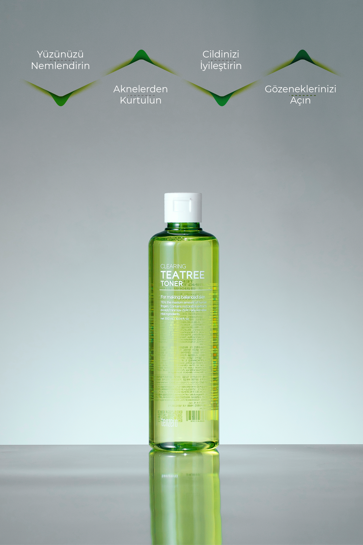 TENZERO Clearing Tea Tree Toner, gözeneklerde oluşan yağ ve kir birikimini temizlemeye yardımcı olurken cildin daha dengeli ve ferah hissetmesini destekler. Özellikle yağlı ve problemli ciltlerin bakım rutininde cildin arınmasına ve daha sağlıklı görünmesine katkı sağlar.